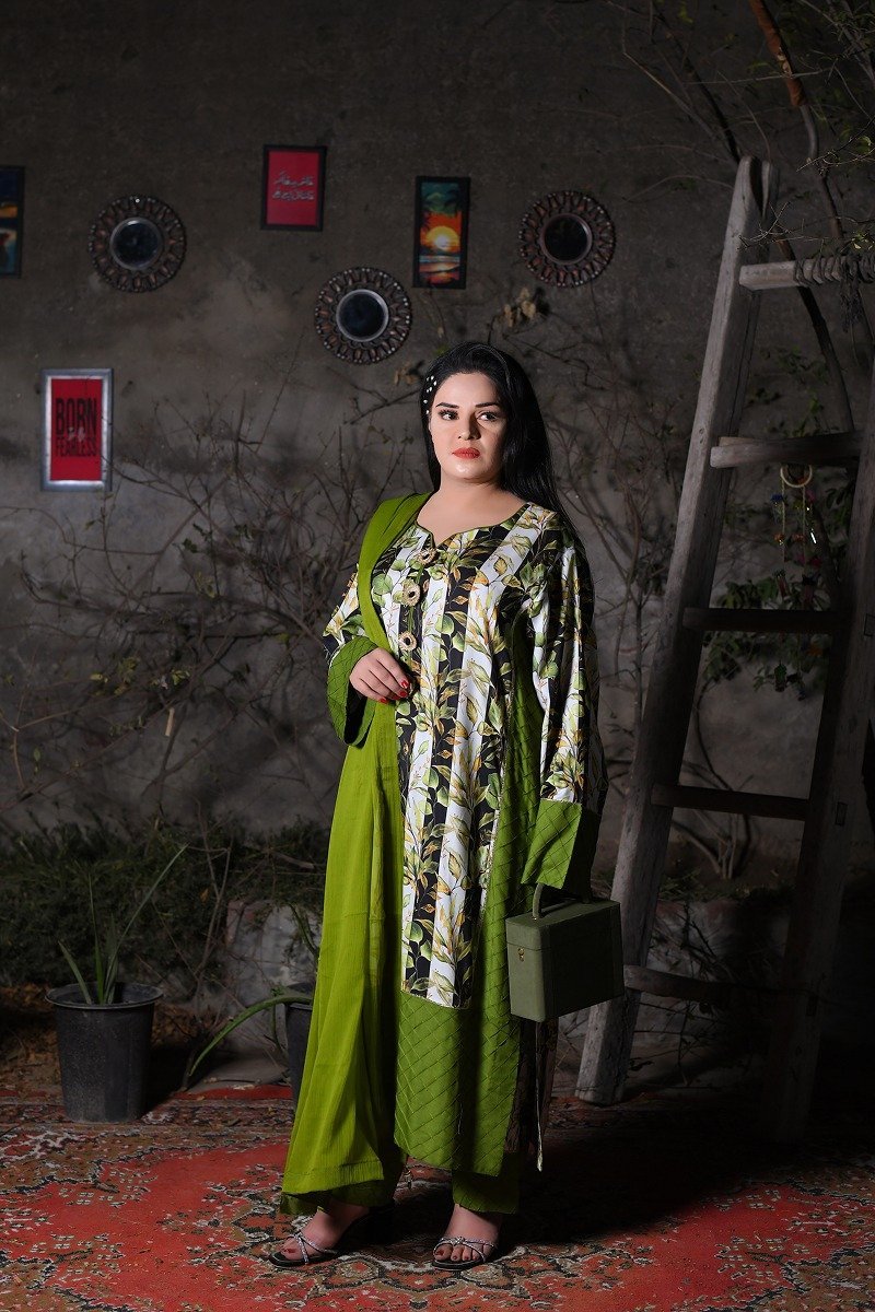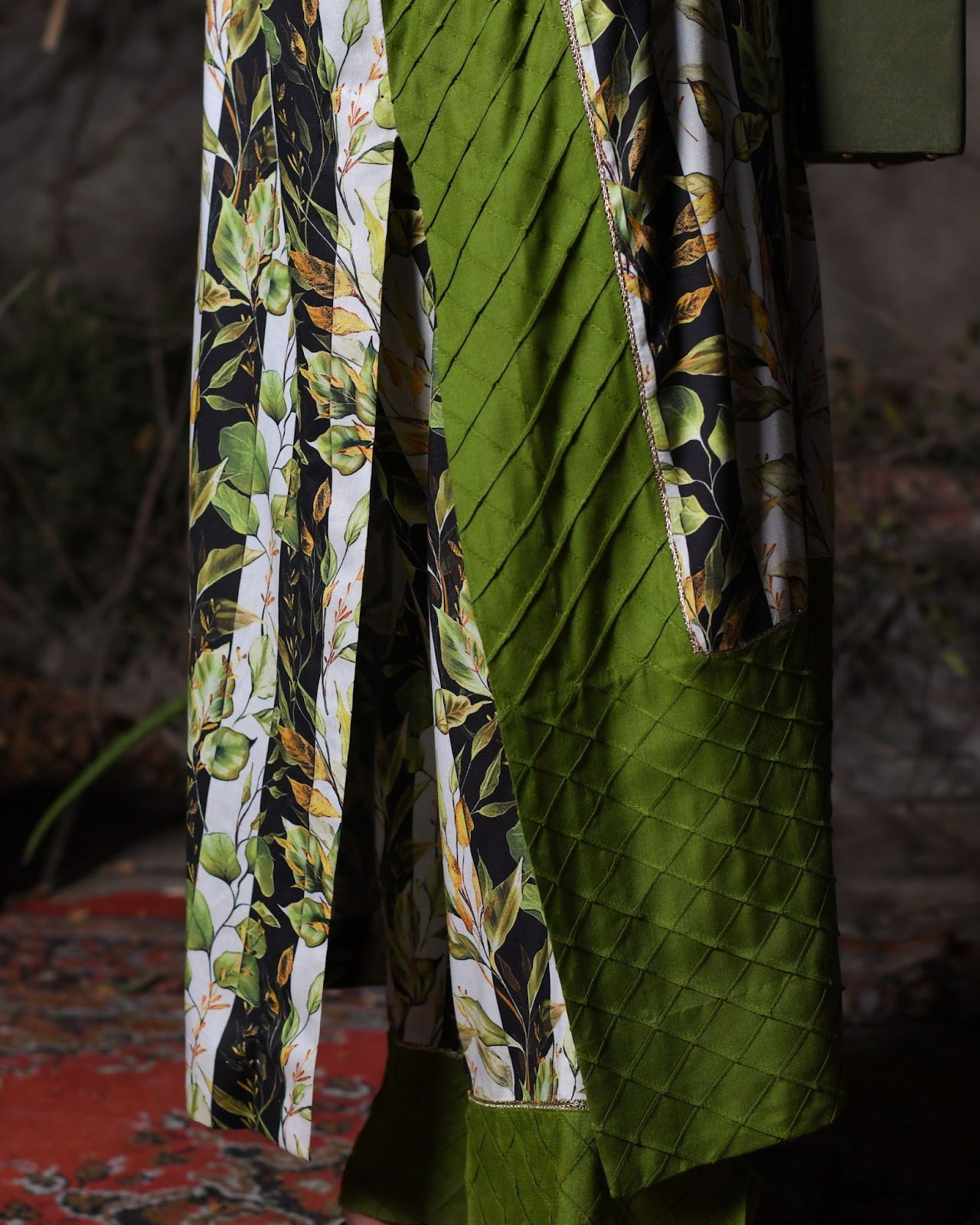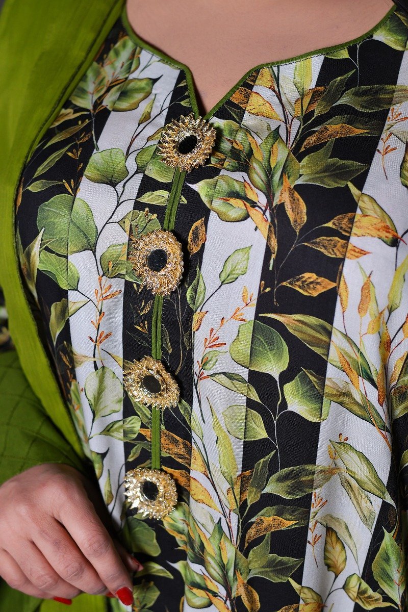 Leaf Print Olive Green & White Everyday Lawn Trouser Suit