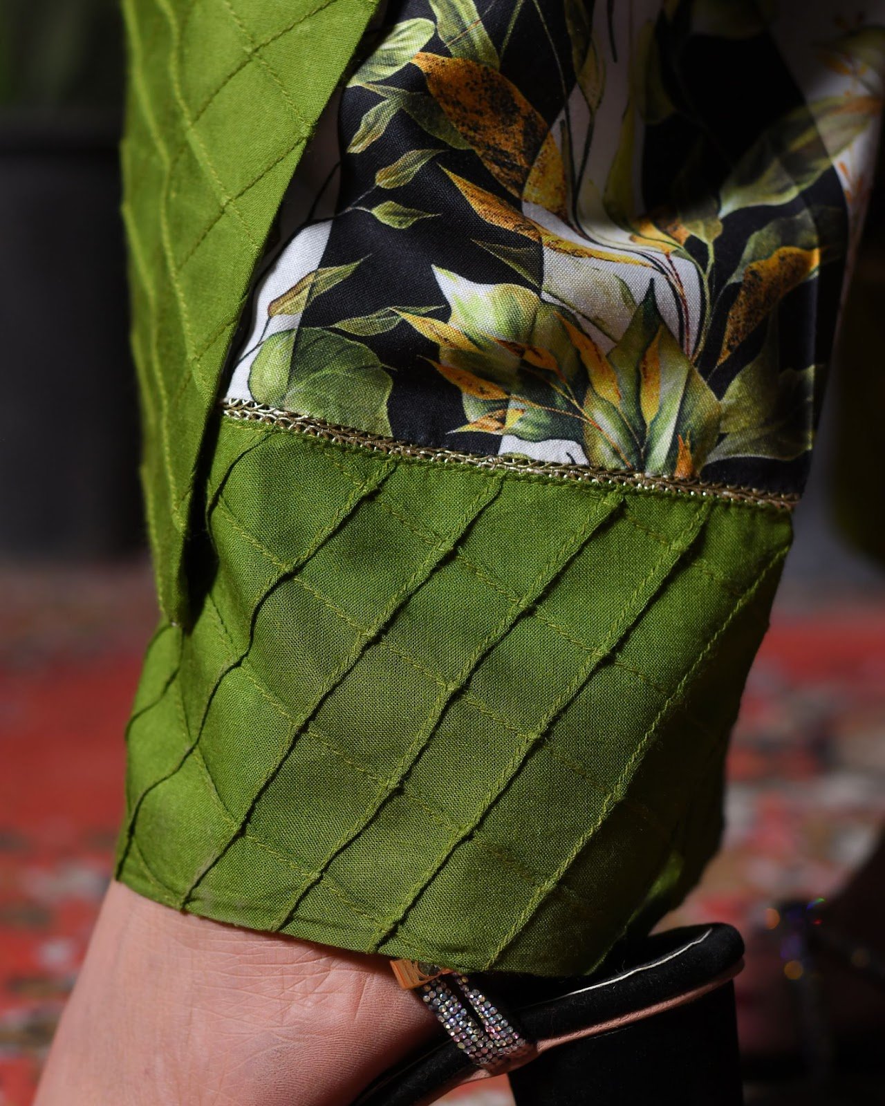 Trouser- Loose straight style – Regular length – All-over matching mixed print with olive green Quilted Cuffs at bottom.