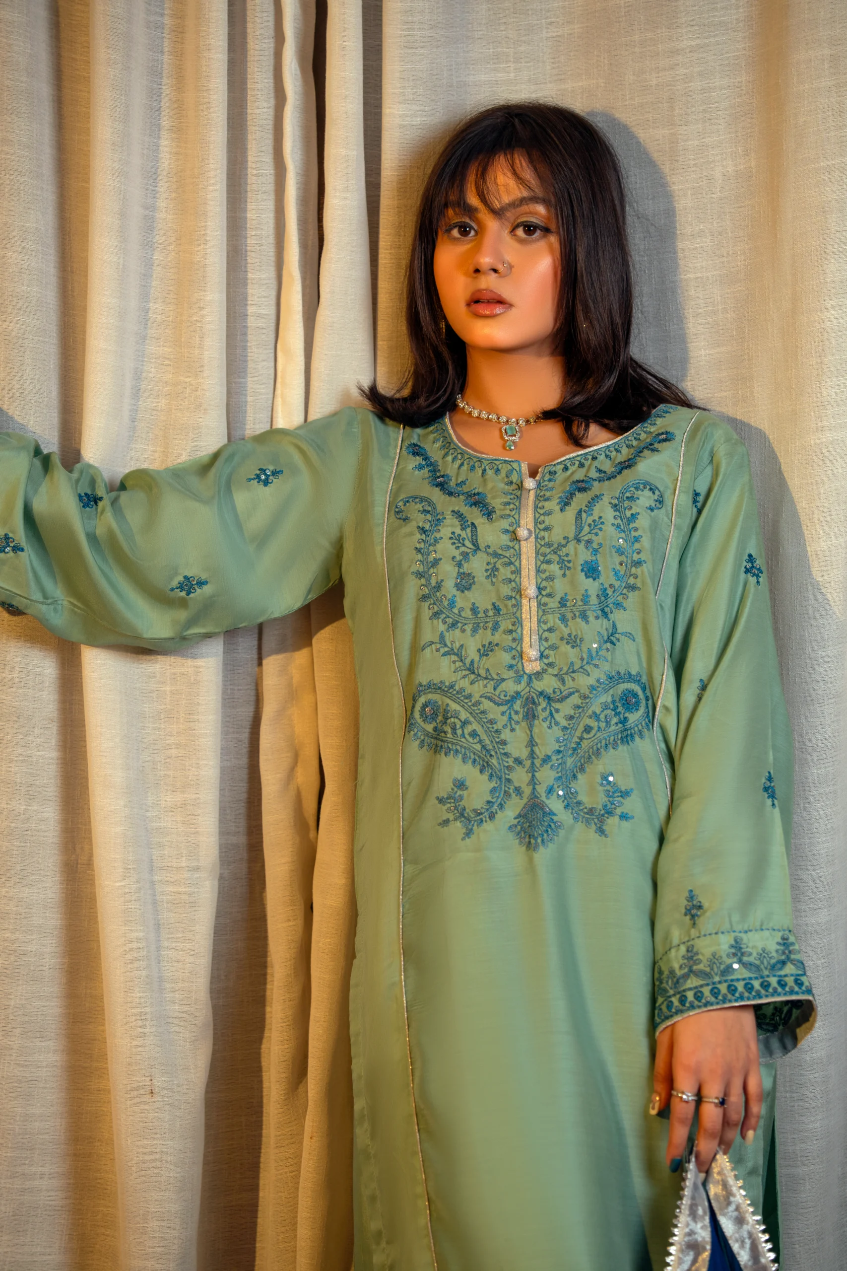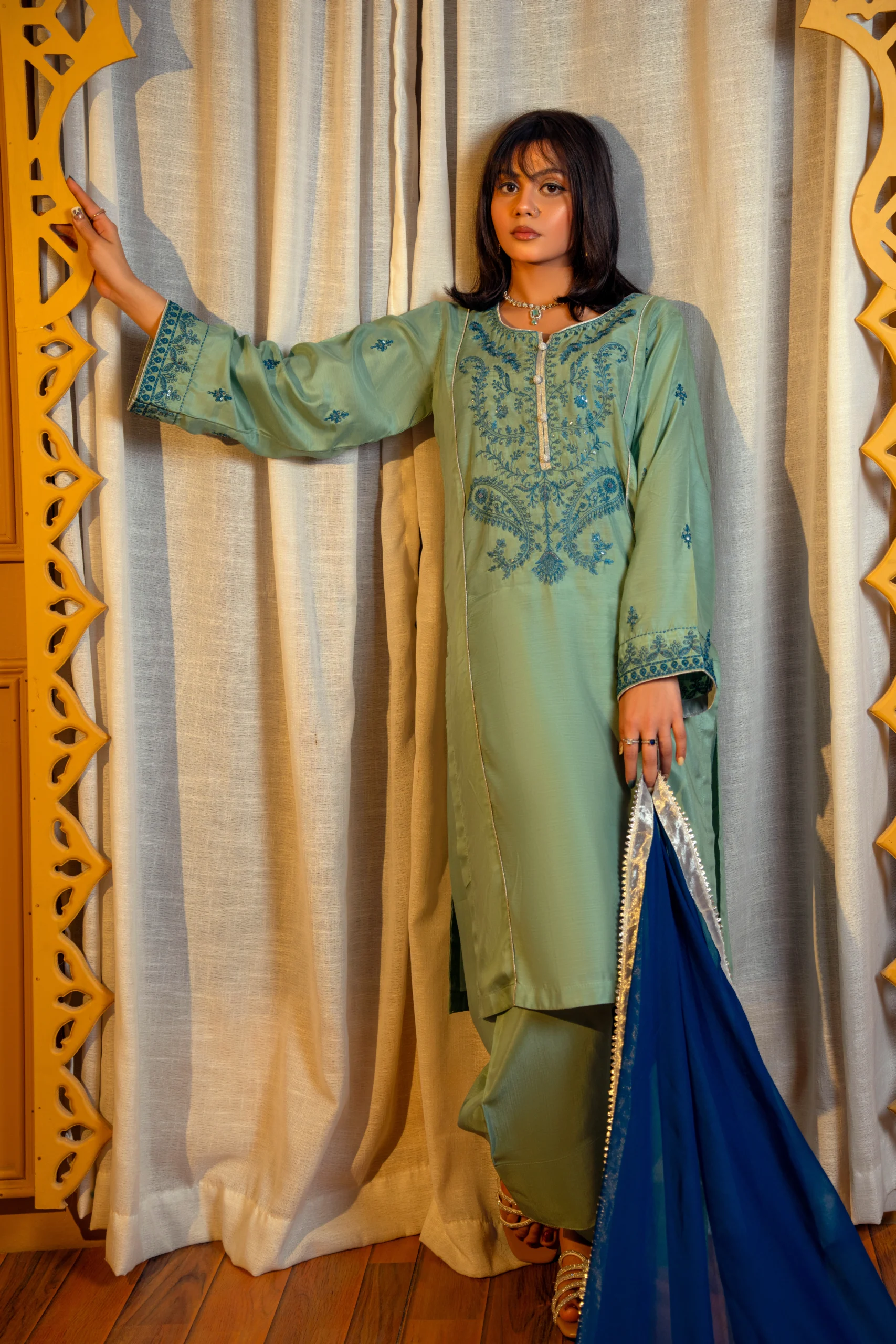 - A simple and elegant mint green suit with bluish thread work on the neck and sleeves.