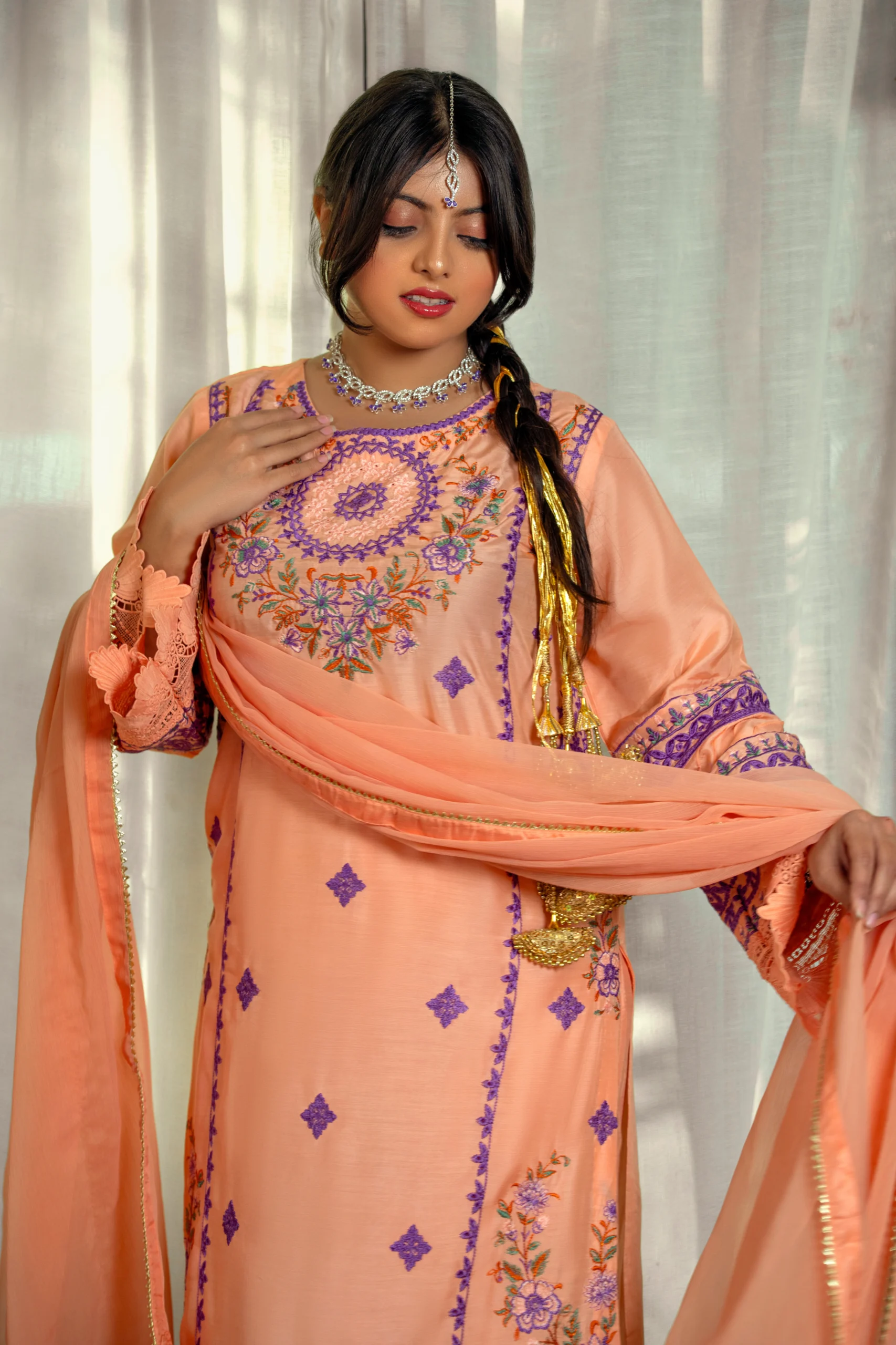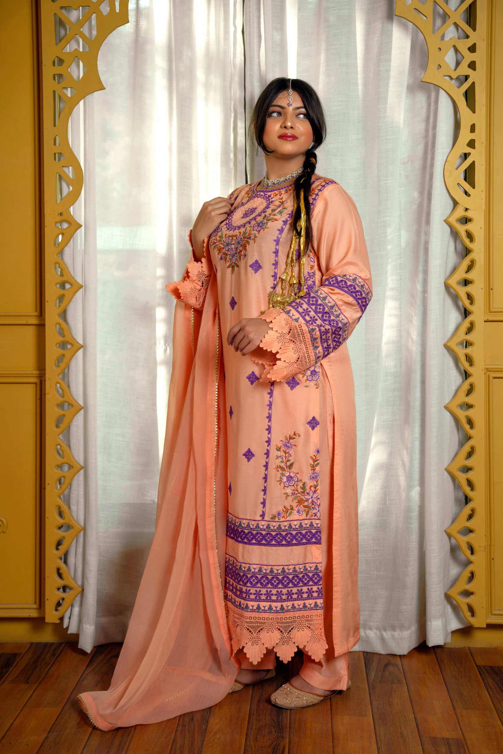 1 – Elegant Peach Viscose suit with intricate plum embroidery and scalloped lace accents.
